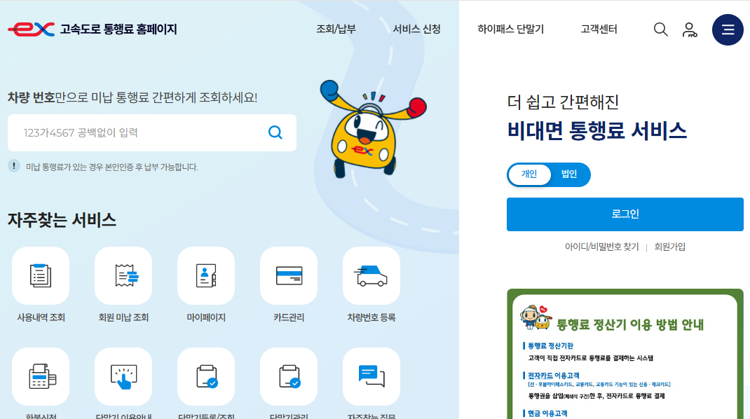 한국도로공사(www.ex.co.kr) 홈페이지에 접속한 후 상단 메뉴의 '통행료 납부'를 클릭합니다. 모바일의 경우 '하이패스' 앱을 다운로드하여 이용할 수도 있습니다.